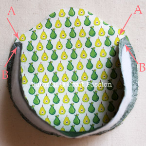 Sew purse to base, from marking “B” to marking “B”. When attaching another side of the purse fabric, sew from marking “A” to marking “A”, matching markings “B to the ends of the base. Clip curve at the seam allowance.
