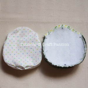 Get ready all the materials as mentioned above. Trace the pattern onto the wrong side of the fabric and add at least 7mm or 1/4″ seam allowance. Mark frame markings on the fabric too. Cut fabric now or after attaching the batting. Trace pattern on batting with a marker on the non-adhesive side. No seam allowance is needed. Cut the batting along the inside of the tracing lines to get the correct shape and size.