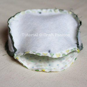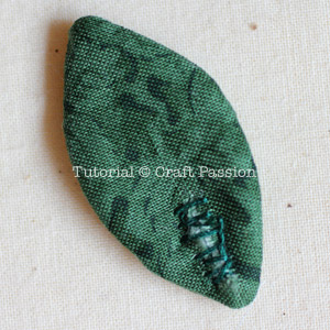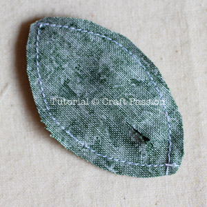 Sew the leaf fabrics together with right side facing each other. Make a small cut of about 1/2″ on the non-batting side. Turn the leaf right side out from the small opening by using a pair of tweezers.