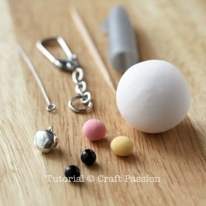 If you prefer a bigger charm, you can always make it into other sizes. This clay piggy charm requires extra-light-weight air-dry clay in white, yellow and pink, and 2 nos. of 5mm black beads. You will also need to prepare some simple tools that you will find in your house: a toothpick and a pen cover. Optional items you might need are a key-chain ring and the accessories if you want to make it into the key-ring charm and tacky glue (sometimes white craft glue works too but it has to be the thick type).