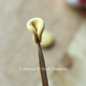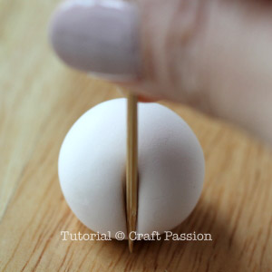 Press the clay ball with a toothpick as shown in the picture, to make a vertical indentation for the front.