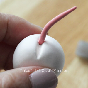 clay pig tailPress the rounded end of the tail onto the vertical indentation at the back of the piggy. Again, if it doesn’t stick well, put a small dot of tacky glue to make it stick well, hold the tail for a moment until it is secured.