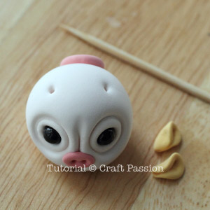 clay pig earsPosition one of the ear pieces on the head, press and hold it down until it descends partly into the head. Press the tip of the ear to shape it.