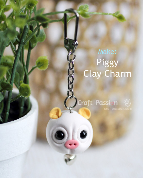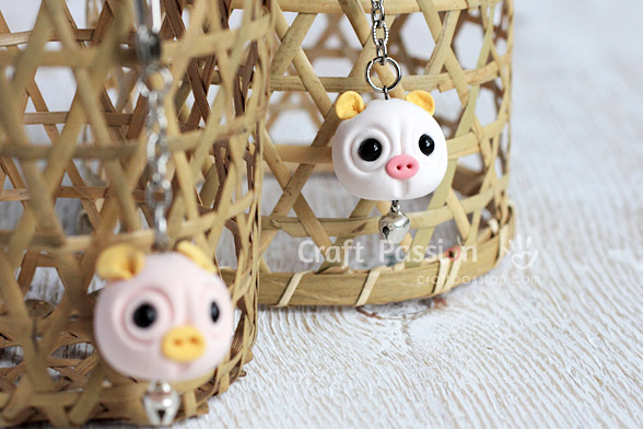 clay pig charmIf you want to make the clay piggy charm into key-chain, insert the eye pin from the top of the clay piggy all the way down until the eye touches the head. Insert a jingle bell and bend the straight end at the bottom of the piggy to form another eye of the pin.