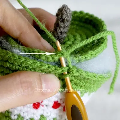 Insert the hook into the next stitch of the pine tree body, followed by inserting it into the last stitch of the base, crochet a single crochet stitch.