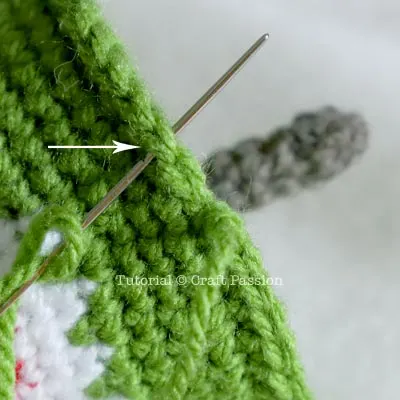 Insert the needle back to the space between the top loops of the last stitch, pull the tail through the back loop of the stitch, as shown in the picture.