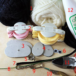 Besides gathering the above materials, you will need the following tools to make this sheep pom-pom. To make a pom-pom, you will need a pom pom maker; for this tutorial, we need 2 different sizes: 1 3/8″ and 1 3/4″. We used the Clover brand pom-pom makers, and you can buy them from the affiliate link. Next, prepare a pair of oval-shaped templates of 1 3/16″ x 2″ long for the trimming of the pom pom for the body, and, another pair of round-tipped tear-drop-shape templates of 1/2″ x 3/4″ with 1″ long for the head and tail.