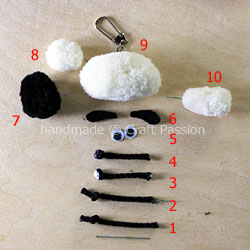 Back to this Pom Pom Sheep tutorial, you will need to do a little trimming to sculpt the shape of the pom-poms, then assemble them together with glue. Prepare some Black and Beige yarn for pom-pom making, preferably wool yarn, so that it looks more like a sheep. A pair of 6mm googly eyes, black cord, wire, black felt, and a keychain if you want to make it into a sheep keychain.