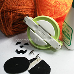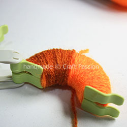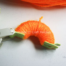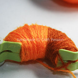Wind the arm of the pom-pom maker with 2 – 3 layers of orange yarn.
