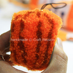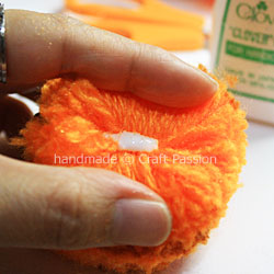 Cut the yarn across and you will see the stripes of brown yarn in between the orange. If you want to know more about the basic of making pom-pom using the pom-pom maker, click here.