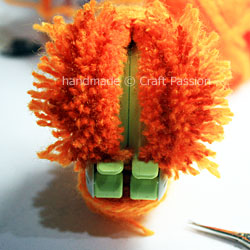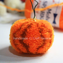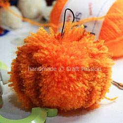 Trim lightly on your pom-pom pumpkin to make it look neat if necessary. Remember to fluff the pom-pom often enough to get the “hiding” yarn out and trim it.