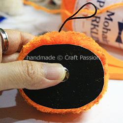 Position the pumpkin template on both sides to trim the pom-pom into a pumpkin shape. Read more about trimming a pom-pom fast and easy here if you don’t know how to do it.