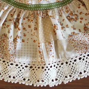 - a. Sew to add the 2″ lace at the bottom of the skirt. Fold and press the overlocked seam allowance upward, topstitch.