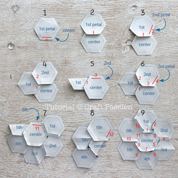 1. As mentioned in the previous image, place the center and the petal hexagon and sew along the red line.