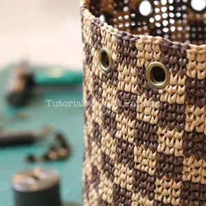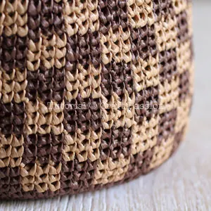 This crochet bag is about 6″ in diameter and 7″ in height. Crochet by raffia yarn, Raffia With Passion, with a 3.5 mm hook. The free crochet bag pattern came with a written pattern, instruction, and step photos, including 2 tapestry designs: Checkerboard (LV Damier inspired) and Chevron. The holes for the drawstring are covered by eyelets, so it is easy for the drawstring to glide through.
