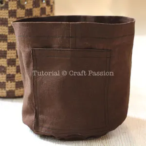Sew the short edges of the rectangle piece together, press seam to one side, topstitch. Sew the pocket to the rectangle piece. Sew to join circle base to them to complete the lining.