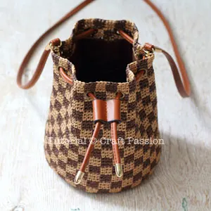 The Damier Raffia Bucket Bag uses about 60g (150m) of Chocolate raffia yarn (#7619) and 40g (100m) of Kraft raffia yarn (#7987).