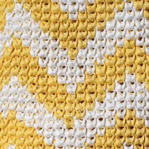 With White (W) and Daffodil (D) Raffia to make a chevron pattern of 12 sts x 10 rows size for each V-shaped stripe. For this chevron raffia bucket bag, there are a 2 rows top and bottom pattern overlap respectively at the middle chevron pattern, hence, total rows for this 3 chevron stripe pattern is 26 rows/rounds, the rest of the rounds is all off white color