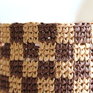 This crochet bag is about 6″ in diameter and 7″ in height. Crochet by raffia yarn, Raffia With Passion, with a 3.5 mm hook. The free crochet bag pattern came with a written pattern, instruction, and step photos, including 2 tapestry designs: Checkerboard (LV Damier inspired) and Chevron. The holes for the drawstring are covered by eyelets, so it is easy for the drawstring to glide through.