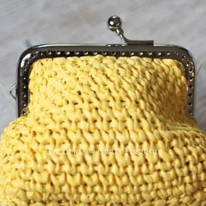 This raffia coin purse with a kisslock frame is about 4″ x 2″ x 3.5″ tall in size. Using 3.5mm crochet hook with 100% natural raffia yarn, Raffia With Passion, crochet in Split Single Crochet Stitch. The crochet coin purse is then lined and sewn to the kisslock frame.