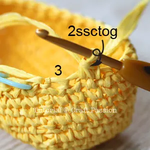 Decrement by crochet 2 split single crochet together (2ssctog).