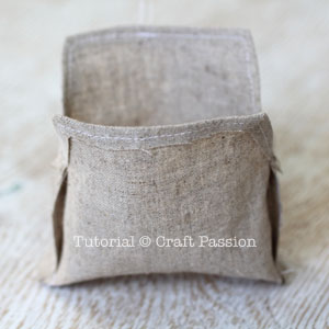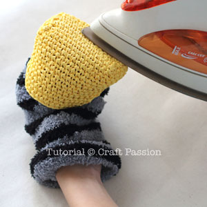 Set iron on medium heat. Block the coin purse by pressing it against a ball of socks (insert into the purse). If you are using other brands of raffia yarn, test the iron on a small part inside the purse.