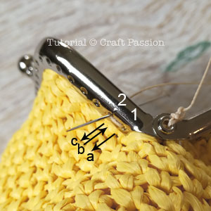 Repeat the stitching (in-out at hole 3, in-out at hole 4, etc) until you finish the whole frame. Make sure the purse edge is pushed into the channel all the time during sewing.