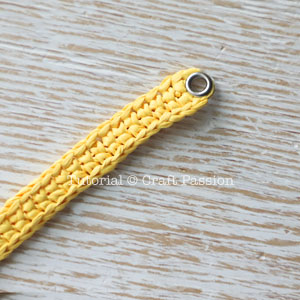 Crochet the strap as per the given pattern. There is a ch3 hole at each end of the strap, use the holes to hook up with jump-ring or a split-ring.