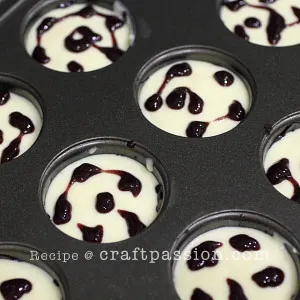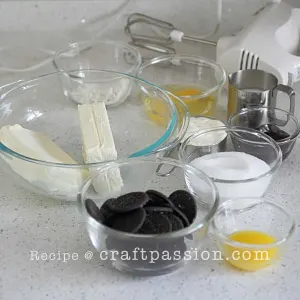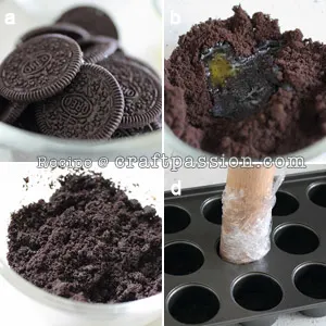 - Break Oreo biscuits (without the cream) into smaller pieces and put them into a food processor, pulse Oreos until they become crumbs. Mix melted butter until moistened. Spoon in Oreo mixture evenly (about 1 to 1 1/2 teaspoon each cup) and press firmly into the base of the mini cheesecake pans with the wrapped rod. Refrigerate them until you have prepared the cheesecake batter.