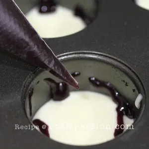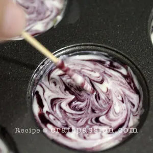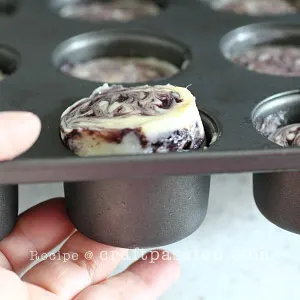 Unlike your normal baked cheesecake that has a sunken top, with this easy but great recipe, the top of the cheesecake is flat and even on the top, giving it a more presentable and smooth finish. Additionally, the marbleized effect of the blueberry topping for cheesecake adds beautiful artwork to the cheesecakes, the mild tangy blueberry taste from the puree also adds another dimension to the cake and it balances out the creamy milky taste, preventing it from sticking to the roof of your mouth as much. To enhance the blueberry topping for the cheesecake, you may add some fresh blueberries or other fresh fruit to the mini blueberry cheesecakes or even sprinkle some lemon zest on them before serving.
