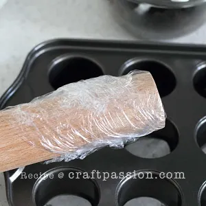 - Grease 2 Mini Cheesecake Pans, and line the bottom with parchment paper. Wrap your rolling pin or any flat-end rod that can go into the mini cheesecake pan with cling film.