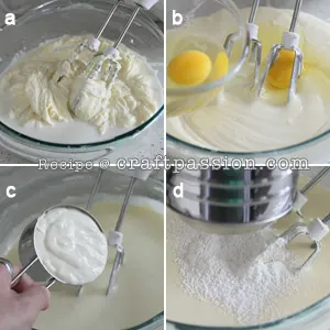 To attain a crack-free tangy cheesecake, do not overbeat the eggs! If you do not have an electric mixer you can always use a hand mixer. Mix the ingredients in a large mixing bowl (Refer to Method 5 below) at low speed or medium speed until all of it is well incorporated and smooth. If you continue mixing at this point too much air will mix into the filling causing it to rise quickly as it bakes. This will then cause your cheesecakes to sink and crack.