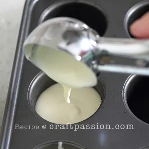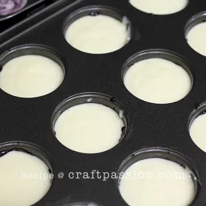 - Bring out the mini cheesecake pans from the refrigerator, and fill each cup with cheesecake batter until 1/3 the height.