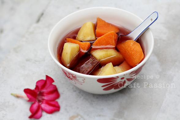 After the recent holy festival with a great serving of food, drinks, treats… with all the non-stop eating, chatting and laughing, we have got ourselves each a bloating stomach {imagine…. the belly of Santa Claus >. This Sweet Potato soup in ginger syrup is very much needed to cure the bloating.