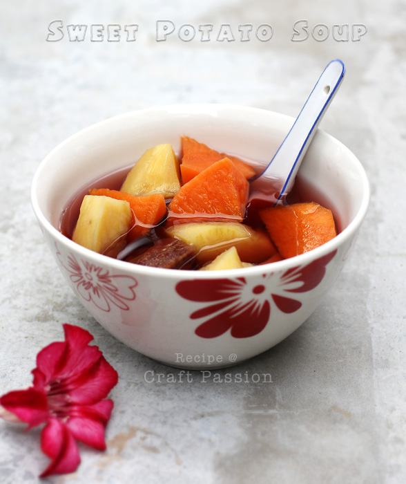 Sweet Potato soup in ginger syrup is a typical Asian sweet dessert soup. It is very easy and quick to prepare and cook with literally no failure at all. The dessert soup is sweet along with the fragrant of sweet potato and ginger, and just like ginger tea, it is a little spicy.