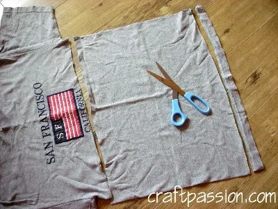 - We only need the bottom-halve portion of the T-shirt. Cut horizontally from sleeve to sleeve as shown above. Cut away the end border of the T-shirt too. This useful” portion must be plain and free from printing, embroidery and any joints or seams. Any motifs will be too hard for the T-shirt to turn into tubular yarn.