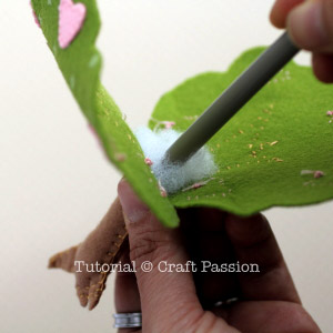 6. Stuff the trunk with poly-stuffing. You have to do it now and not after you have sewn up the tree. Use a pen to push the poly-stuffing in. Massage the trunk to even out the poly-stuffing if necessary.