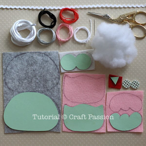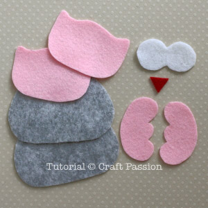 Download and print the pattern template on paper or on cardstock, cut the templates out, and trace them on the felt with a ball pen according to the color shown in the picture.