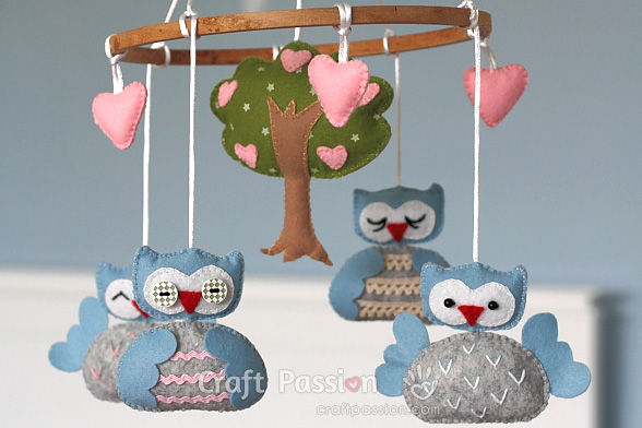 Get the full article at https://www.craftpassion.com/sew-a-nursery-owl-mobile/