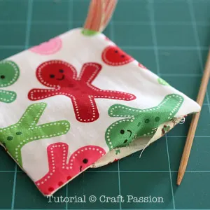 Turn the coaster right side out from the opening, use a blunt awl or knitting needle to push the corner out and neaten it to right angle.