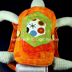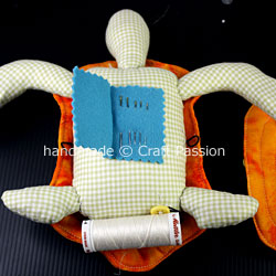 Sew around the body (same pattern as the bottom shell) with blanket stitches and add in the head, tail, and limbs at the respective markings. Stuff the body with poly-fill stuffing before complete the sewing.