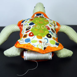 - The rear view of the turtle with a spool of thread at the tail.