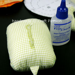 - Snip a small vertical line of about 1.5″ at the center of the body, turn the fabric right side out from this opening. Stuff in poly-fill and mend the opening. If you have fray checks, put a few drops. The opening will be covered by the top shell, no one will see the “scar”.
