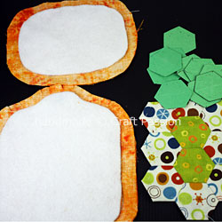 Baste the hexagon quilt block on top of the top shell and slip stitch along the edges of the hexagon block.