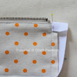 - Bend the zipper, pin to the canvas. Fold the end of the zipper onto the seam allowance. Sew them together just outside the seam line.