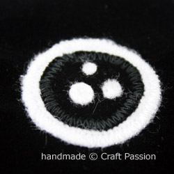 Place white circle felt onto the center of the 3″ black felt, zigzag sew the circumference with a sewing machine. If you hand sew, use blanket stitches.