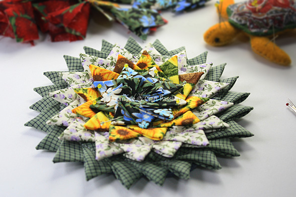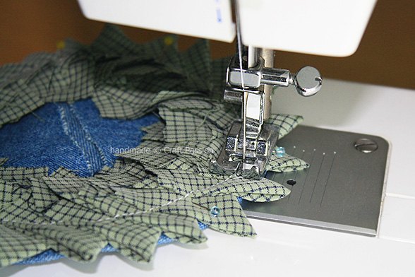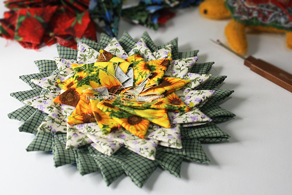 This is the final layer of my coaster. After sewing it, I added a centerpiece to cover up all the messy frays of the triangles. Zig-zag sew the centerpiece and it is done 😉