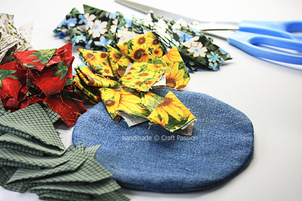 For the coaster, we need to prepare a base (blue round shape) for sewing the triangles on. It can be round shape, or rectangle, or square, or just any shape you want as long you know how to arrange your triangle onto it.