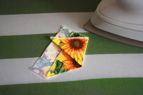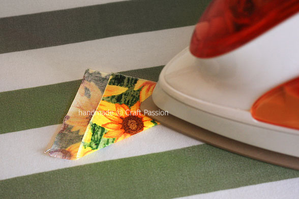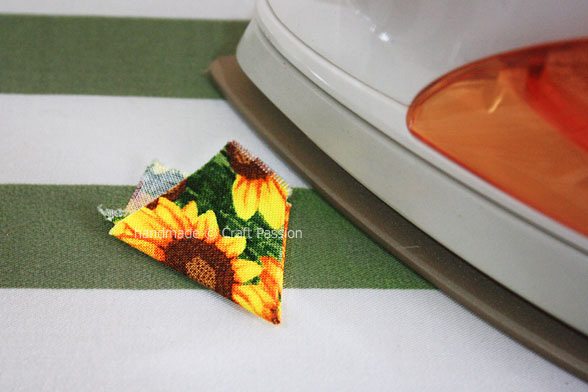 Fold it diagonally and iron it. In order to set the fabric into its triangle shape, I adjusted the heat of the iron to “High”. I ended up having some burn marks on the ironing board after I finished ironing all the triangles… need to get a new iron-board cover LOL…