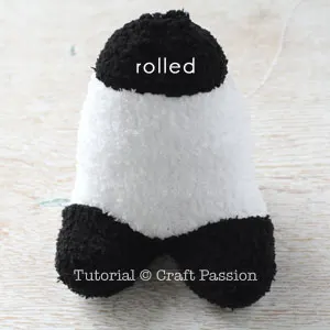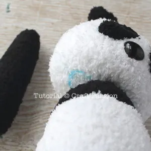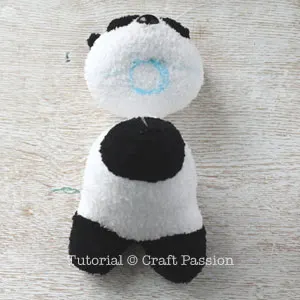 Bring the arms to the back of the panda and stitch to secure the arm’s position, this will add personality to the sock panda.